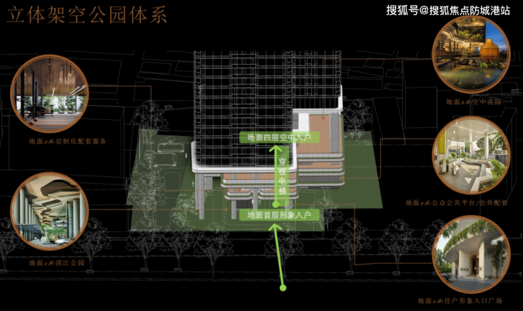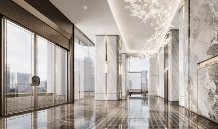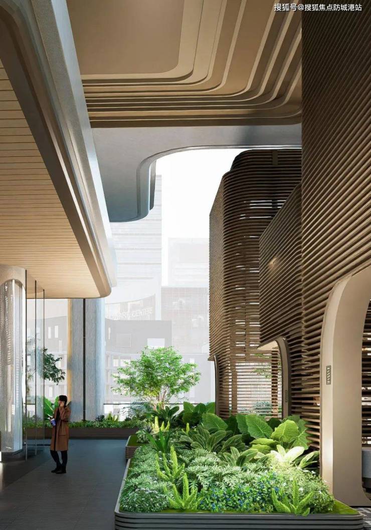 得益于项目架空设计,形成滨江大道、酒店式落客区、入户电梯厅、空中入户平台、南/北塔入户等新型多重归家体系,每一次归家都是仪式感,绿意萦绕。
