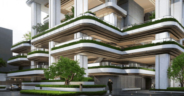 项目以将自然绿意注入建筑空间为理念,参考新加坡Parkroyal酒店设计,同时融合广州传统骑楼特色,创新缔造了一座「全新立体空中花园式地标大平层豪宅」,将生活与景观相互渗透,营造“垂直花园城市”的意境,赋予人们一个富有品质感与生命力的“家”。