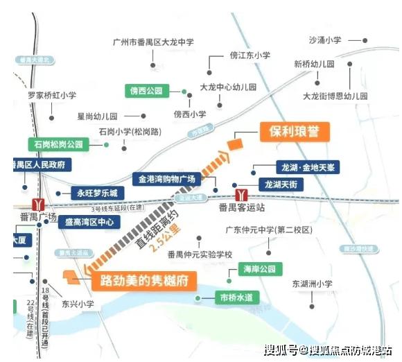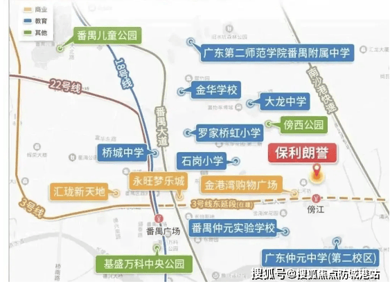 保利琅誉位于番禺广场板块,地处番禺客运站北侧,紧邻龙湖金地天峯。交通优势尤为突出,距离已开通的 3 号线东延段傍江站仅约 500 米,从小区出发乘地铁 1 站即达番禺广场站 —— 这里是 3 号线、18 号线、22 号线、3 号线东延段及规划中 17 号线的五轨交汇枢纽,1 站畅行琶洲,2 站直达珠江新城,无需换乘即可快速通勤广州核心区。