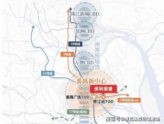 答:距离 3 号线东延段傍江站约 500 米,1 站到番禺广场五轨枢纽,2 站直达珠江新城,无需换乘,通勤广州核心区十分便捷。