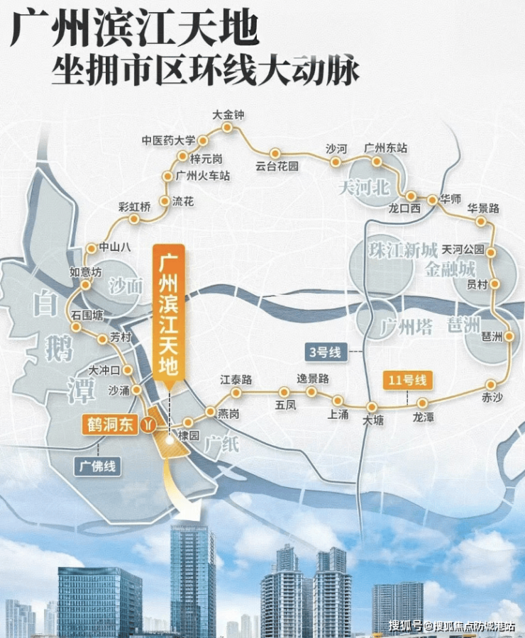 项目位于广州地铁11号线鹤洞东站上盖(预计2025年开通),3横2纵大路网+公交站场+水上巴士,形成半小时城央生活圈、1小时湾区生活圈。实测数据显示,从项目出发: