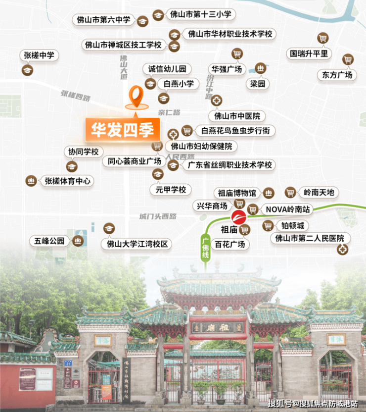 华发四季扎根于祖庙板块核心区域,周边1公里范围内涵盖教育、医疗、商业、生态等全维生活配套,真正实现了“步行生活圈”的便捷体验。虽然项目不紧邻地铁,但凭借多元出行方式保障了通勤的灵活性。项目家门口设有公交站点,可便捷通达禅桂各地;自驾出行则依托佛山大道、汾江中路等城市主干道,快速连接佛山各区。此外,距离广佛地铁祖庙站直线距离约1.8公里,通过短途接驳即可融入广佛轨道交通网络,满足跨区通勤需求。