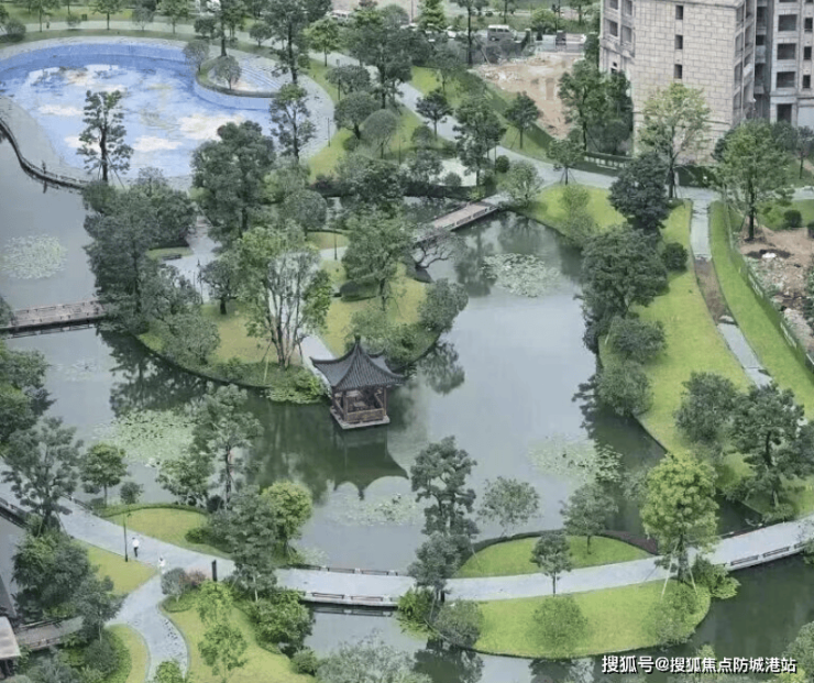 绿化率:36.5%,社区内部打造约 10 万㎡中央苏式园林,全冠移植名贵树木,三重水系环绕,亭台廊榭,移步换景