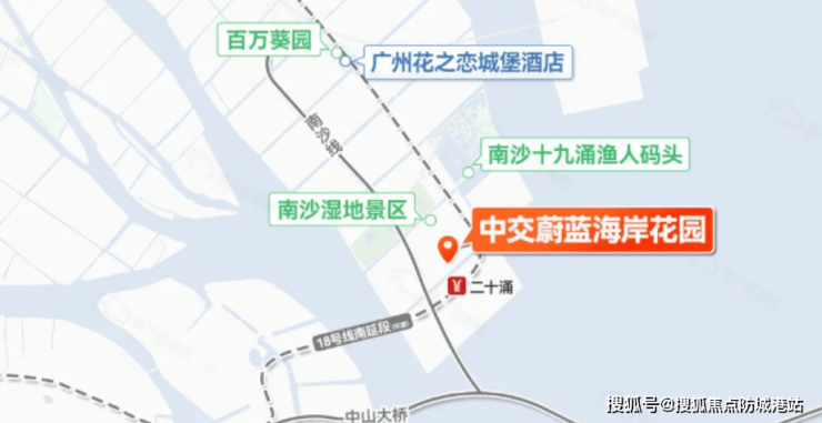 中交·蔚蓝海岸所处位置极为优越,是广州南拓发展轴与黄金内湾的战略交汇点,未来将作为大湾区中心极核和广州南部的重要门户枢纽。通过深中通道南沙线收费站,驾车仅需半小时即可抵达深圳前海。同时,距离正在建设中的地铁18号线南延线二十涌站仅有500米的距离,该线路设计时速高达160公里/小时,预计将成为连接广州、深圳、中山和珠海的大湾区交通枢纽。