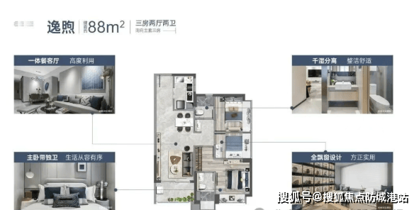 建面约88㎡三房两卫:双卫配置,提升居住私密性与舒适度;