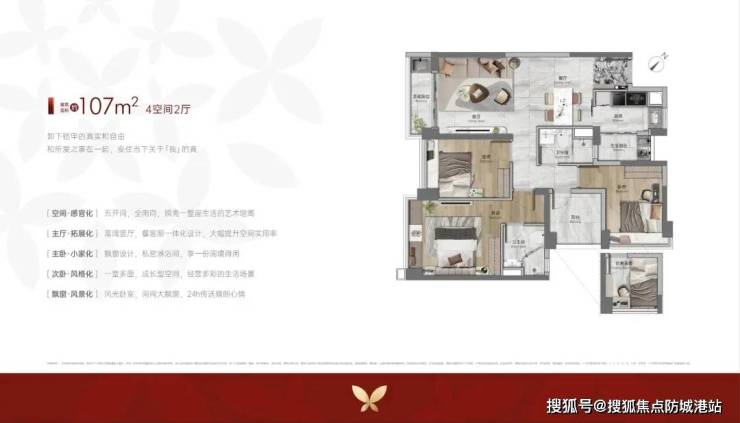 126㎡四房:总价约516.6万元,双主卧设计,得房率超85%;