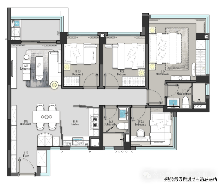 景观视野:蝶形楼栋设计实现户户单边位,南北通透,主卧飘窗与次卧飘窗形成对流,避开卫生间异味干扰。