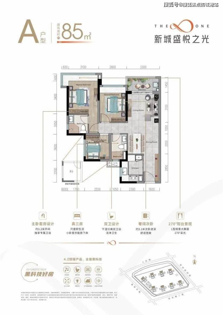 目前推出建面约85-115㎡产品。我们先来看看建面约85㎡三房,双卫带主套设计,尽展尺度,可实现一步到位。