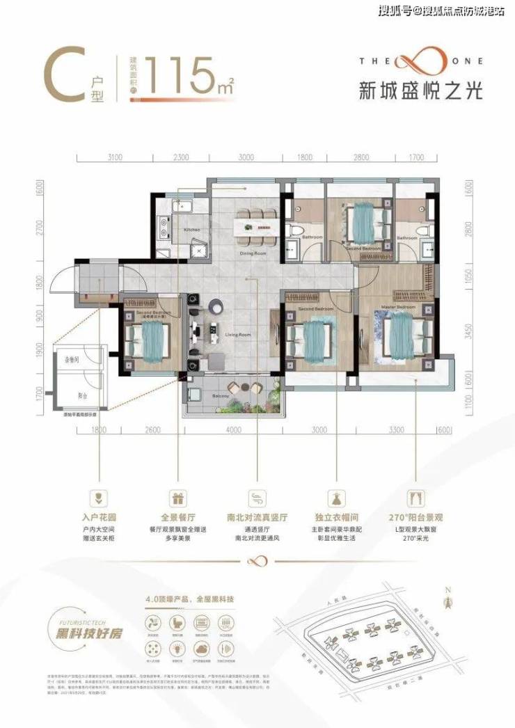 最后来看看建面约115㎡四房,4开间朝南,餐客厅开间约4米,尺度更大,家庭聚会随时能从容上演。