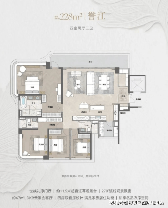 部分主力户型更配备约16米L型阳台与270°环幕全景舱设计,转角无立柱,将浩瀚江景无缝引入室内。清晨江雾缭绕,傍晚霞光映水,四季流转皆成窗前景致。LDKB洄游方厅布局搭配11.5米超阔开间,让餐、客、厨、阳台形成流畅动线,江风穿堂而过,生活与自然真正融为一体。