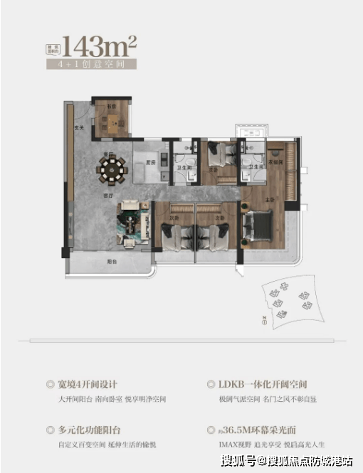 143平方米四房两厅两卫:大户型设计,适合大家庭或有改善需求的购房者,配备多元化功能阳台。