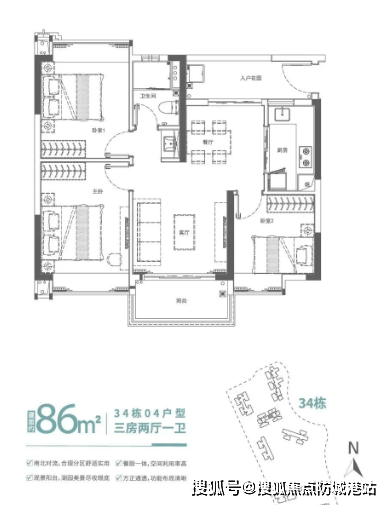 建面约86㎡南北通透三房:南北对流,采光通透,布局方正舒适实用。