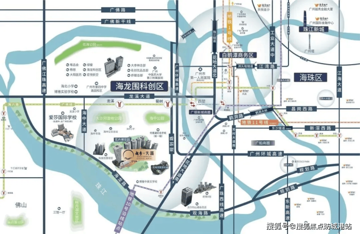 越秀天瀛坐落于荔湾区海中街道,地处花地河南岸,北接大沙河湿地公园,南望花卉博览园生态绿廊。虽然距离白鹅潭核心区约10公里,但项目精准锚定“海龙国际科技创新区”这一新兴发展极核。