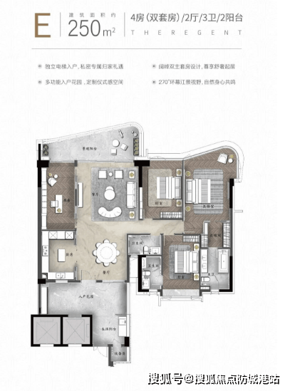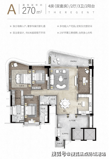 建面约 270㎡ 四房两厅三卫(洋房 A 户型):江景大平层王牌,270° 环幕江景设计,客厅连接约 9 米超大邮轮式阳台,一线望江无遮挡;专梯专户,私享约 28㎡空中双花园与 28㎡私家庭院,拓展空间灵活(可改茶室 / 书房);主卧面积超 42㎡,配备 270° 环幕江景飘窗、独立卫浴(四分离)与步入式衣帽间;双主套房设计,公共空间开阔(餐客厅面积超 60㎡),适合对 “江景视野 + 空间尺度” 有高需求的塔尖家庭,是项目 “明星户型”。