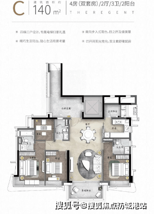 建面约 140㎡ 四房两厅两卫(洋房 C 户型):高端改善入门款,全南向设计,三卧室朝南,客厅连接观景阳台,享社区园林景观;独立电梯入户,同享两千万豪宅交标(如品牌洁具、定制柜体);双主套房设计,主卧配备独立卫浴与观景飘窗,保障主人隐私;全屋精装交付,适合年轻高净值家庭,低总价即可享受 “低密岛居 + 仲元名校”,性价比突出。