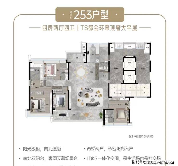 205㎡四房:2梯2户,南北对流,双阳台(南阳台7.2米,北阳台3.5米),双主卧套间(父母房+主人房,都有独立卫浴),适合三代同堂。
