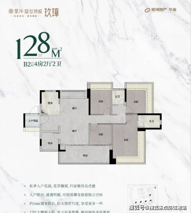 项目由经验丰富的星河控股集团打造,35 年城市运营经验,资产规模超千亿,品质有保障。占地 25 万平,建面 130 万平,容积率 3.25 ,绿化率 35% ,车位配比 1:1.2 。住宅分 5 期开发,11 - 15 层的低密小高层,2 梯 5 户。
