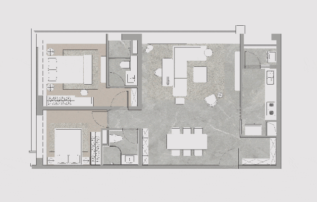 该户型为项目中的高端产品,拥有约7米宽幕阳台,视野开阔无遮挡。主卧套房配置步入式衣帽间与双台盆卫浴,彰显主人格调。全屋多处采用落地窗设计,最大化引入自然光线与江景资源。