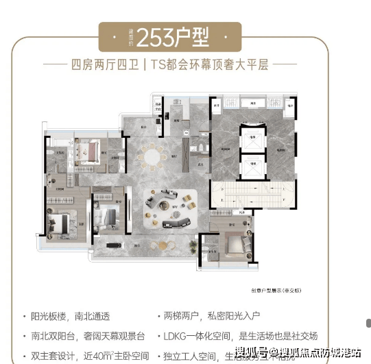建面约253㎡定奢五房:同样是中轴园林上的环幕景观楼王,限量级CBD低密板式高层,专梯专户设计,私属电梯门厅,四开间朝南,南北对流阳光满格,双阳台设计,拥有约10.3米宽巨幕阳台,景观视野极佳,双主卧套房,孩子拥有独立空间,总统级主卧奢套,配备步入式衣帽间、双洗手台、浴缸,全方位满足高端改善家庭的居住需求。