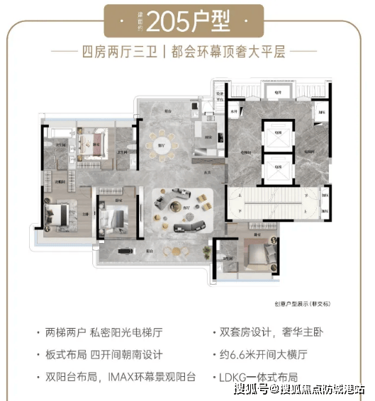建面约205㎡奢适四房:中轴园林上的环幕景观楼王,限量级CBD低密板式高层,专梯专户设计,私属电梯门厅,尽显私密尊崇,四开间朝南,南北对流阳光满格,双阳台设计,拥有近9米宽巨幕阳台,视野开阔,双主卧套房设计,让孩子多一度独立空间,总统级主卧奢套,配备步入式衣帽间、浴缸,彰显奢华质感。