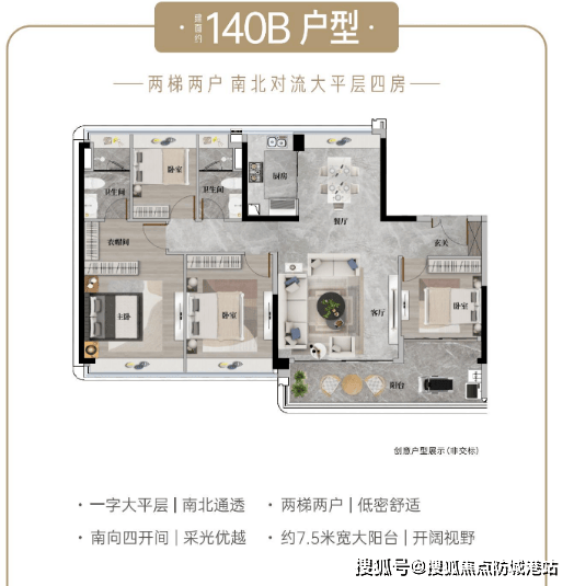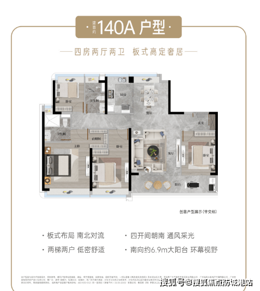 建面约140a㎡高定四房:该户型性价比至高,拥有少有高层景观,视野更开阔,纯板式布局,南北对流,阳光满格,全屋精装交付,可享受酒店式星级居所体验,空间布局合理,动静分区明确,满足三口之家或二胎家庭的居住需求。