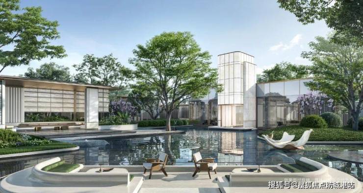 龙湖亚伦・央璟颂虽未集萃梁园造园之精髓、参照梁园半边亭,但复刻安缦酒店 “自然隐奢” 基因,打造「归心六屿」度假园林,约 10000㎡复合双中庭,将江岛生态与生活融合。