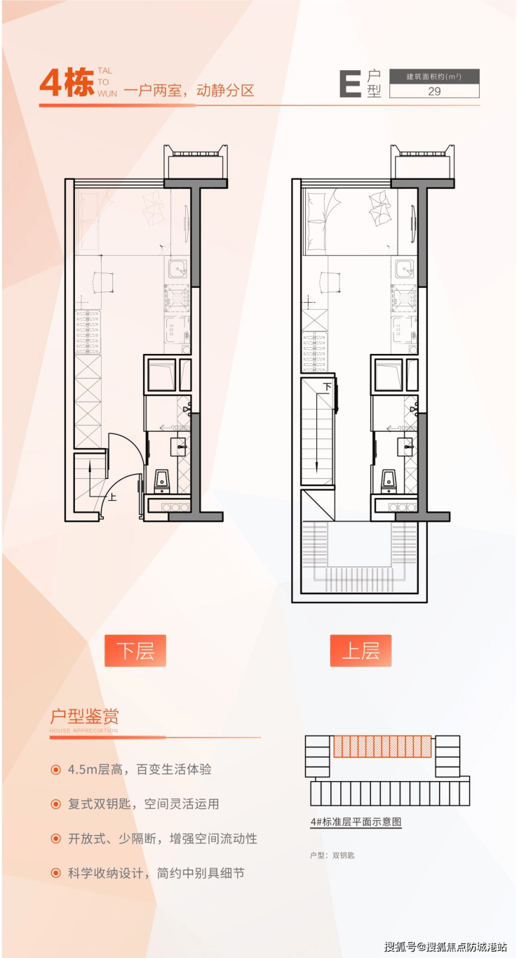 A3:项目主力户型为30-42㎡双钥匙复式,户型灵动多变,上下空间互不干扰。总价约75万起,根据户型、楼层、朝向不同,价格有所差异。根据项目官方数据和板块租赁市场行情,投资回报率超6.5%,可实现以租抵贷,租金收益稳定。