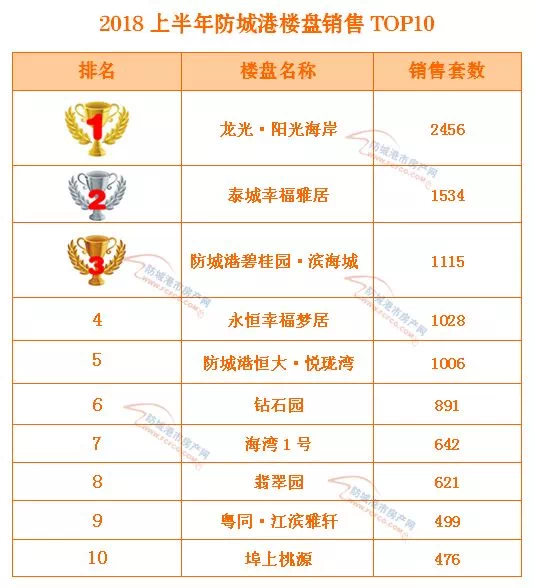 纵观今年防城港市年中成交TOP10榜单,不难看出不少上半年备受热议的各大“网红盘”,均是亮点多多的好楼盘,占据前海后湖地理优势的千亩大盘——【龙光·阳光海岸】火力全开,以2456套的成交量遥遥先进,毫无意外的继续蝉联销冠之位;而位于防城港高铁商圈、三站合一的,交通网络发达的【泰城幸福雅居】(PS:即“四通八达”楼盘旗下组团名称)则成功跃居亚军;另外,今年位居防城港行政中心区CBD核心位置的【防城港碧桂园·滨海城】,这是碧桂园在防城港开发的排名前列项目,尽管今年2月才正式开盘,却也成功闯进三甲,实至名归,摘得了季军,值得注意的是,在这前十的榜单中,除了碧桂园为纯新盘首开,其余的九个均属老盘加推。