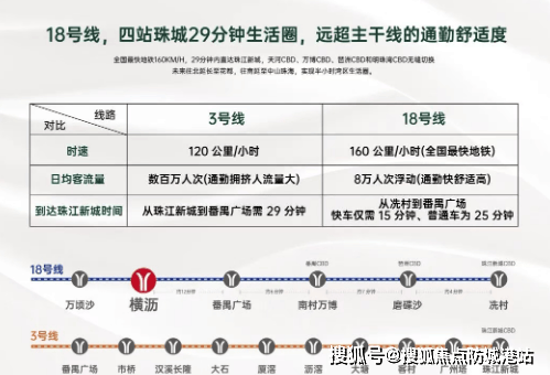 项目距离地铁18号线横沥站直线约400米,步行约5–6分钟即可进站。18号线作为广州首条时速160公里的高速地铁,无需换乘即可实现: