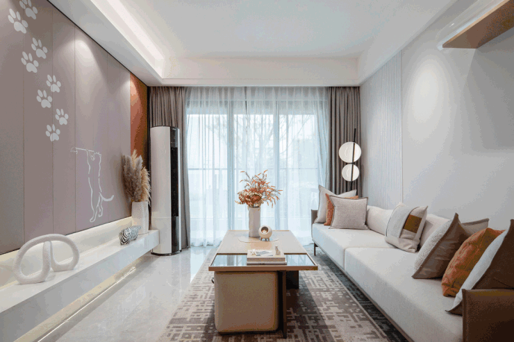 暖粉色丰富客厅视觉层次,猫咪元素装饰点缀,唤醒空间活力。落地窗采光充足,可以在客厅一边看书一边撸猫。