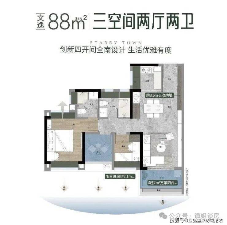 A户型:配置南向观景玄关,仪式感入户;客厅与主卧双南北对流,通风极佳;交互式方厅设计,空间灵活多变。