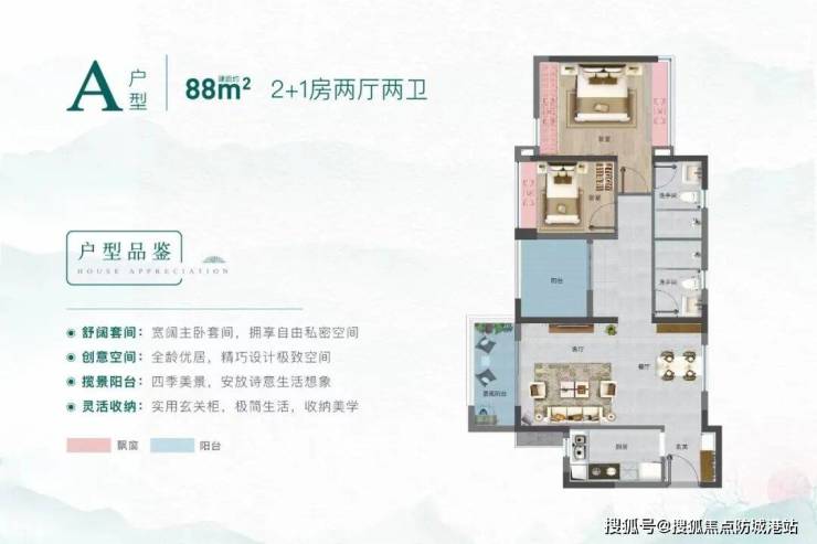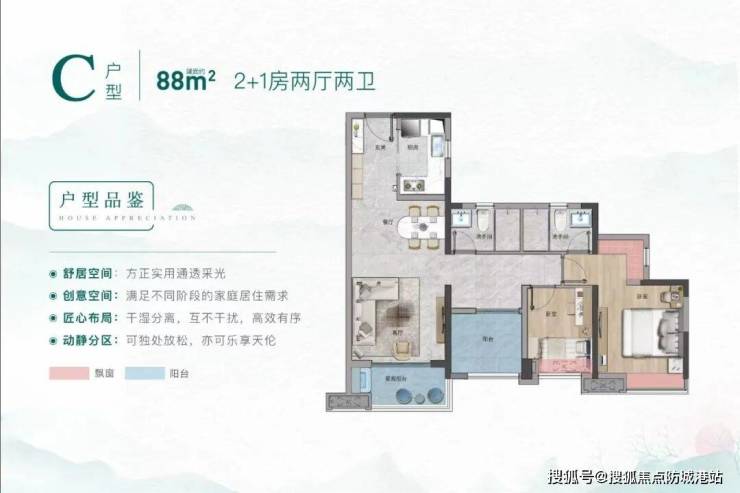 其中建面约88㎡的2+1户型有A、C两种,A户型实现了南北对流,同时主卧+次卧合计赠送了三个大飘窗,空间利用率直线up up up!