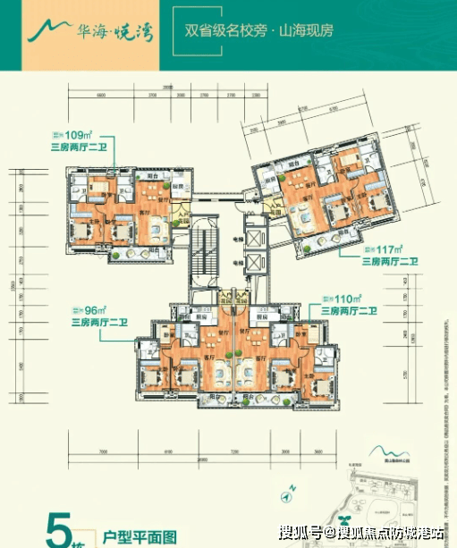 119㎡三房两卫:四开间朝南,主卧套房,部分单位享山景或海景。