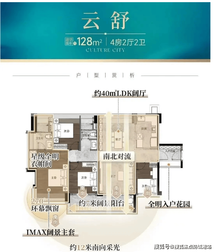 建面约128㎡四房两厅两卫:该户型定位改善进阶,适配二胎家庭或三代同堂,整体布局大气开阔,南北对流,拥有约16米南向采光面,采光通风效果极佳,室内空间通透,告别潮湿与闷热。户型最大亮点是拥有约40㎡LDK阔厅,碾压市场同面积产品,客厅、餐厅、厨房一体化设计,空间开阔,可满足家庭聚餐、朋友聚会等各类场景需求;阳台与阔厅相连,视野开阔,可俯瞰社区园林与湖景,休闲观景体验极佳;主卧套房设计,配备独立卫生间、衣帽间与飘窗,空间宽敞舒适,彰显主人尊崇身份;其余三个次卧尺度充足,均能放下1.8米大床与衣柜,兼顾长辈与孩子的居住需求;户型动线合理,动静分区清晰,休息区与活动区互不干扰,保障家人休息质量;厨房采用U型设计,操作空间充足,方便日常烹饪,提升生活便利性。