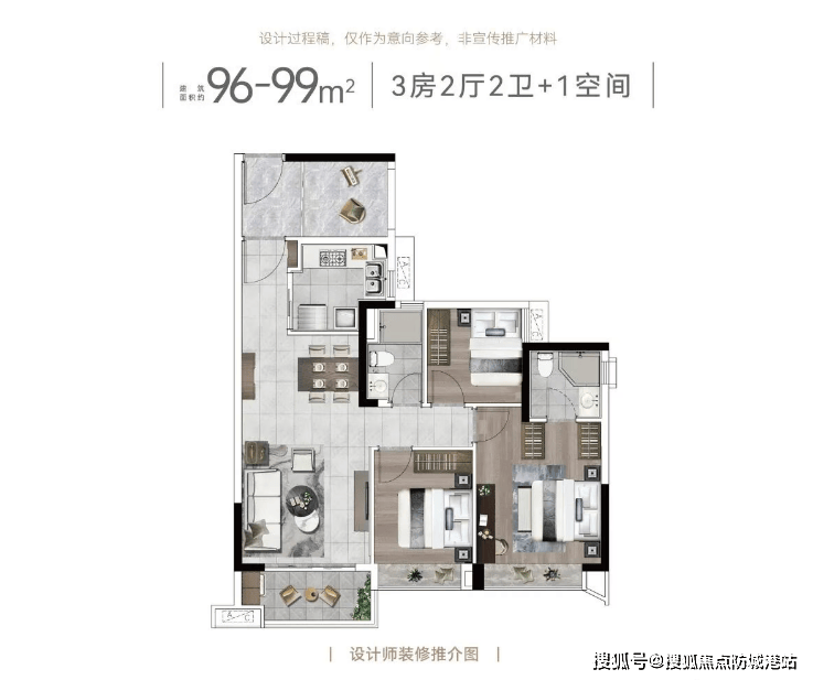 2. 105㎡三房两厅两卫(改善刚需户型):面积段105㎡,三房设计,空间比89㎡户型更开阔,得房率91%,实际使用面积约95㎡,适配改善型刚需家庭。