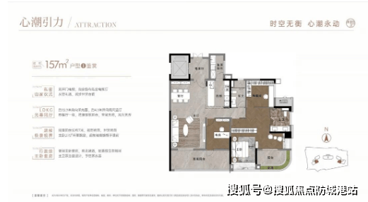 建面约157㎡四房:传统竖厅设计,动静分区合理。厨房后方配备生活阳台,主卧拥有270°弧形飘窗,采光与视野极佳,是入门级豪宅的优质选择。