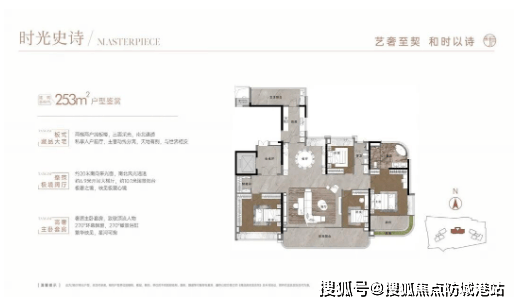 建面约253㎡楼王户型:位于中间栋王位置,两梯两户专梯专户,层高3.3米。南北对流,拥有10米超长阳台。主卧飘窗及主卫均采用270°弧形采光面,视野无敌,专为家族领袖量身打造。