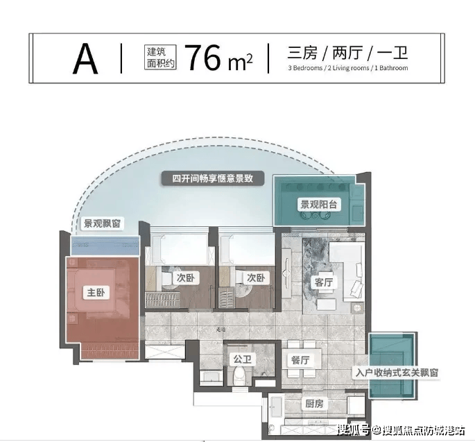76㎡三房两厅一卫:南向布局,主卧带飘窗,干湿分离,总价约260万起,刚需上车首选;