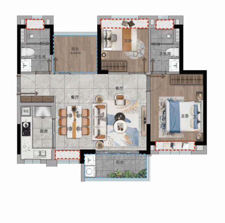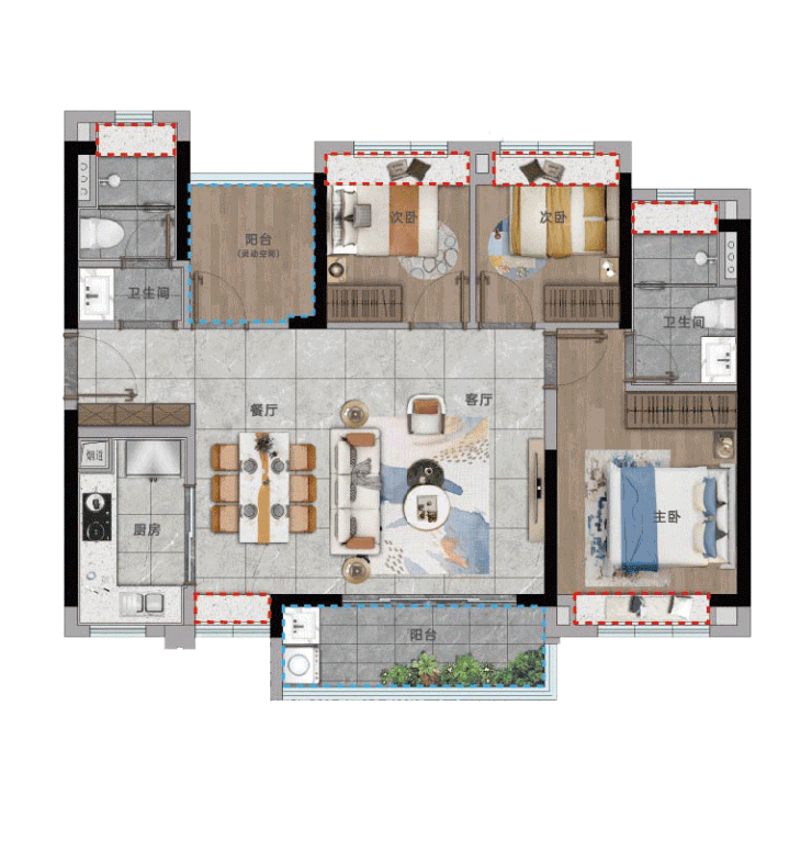 特点:横厅设计,搭配餐厅飘窗及超大阳台,纯南朝向,全屋超大飘窗设计,南北对流,通透明亮,主卧套间尊贵感十足。
