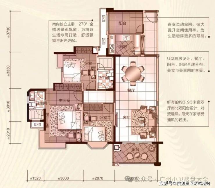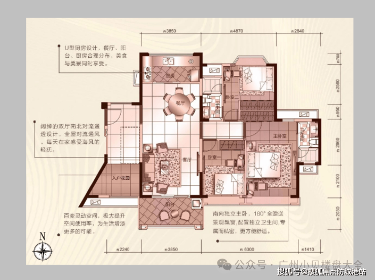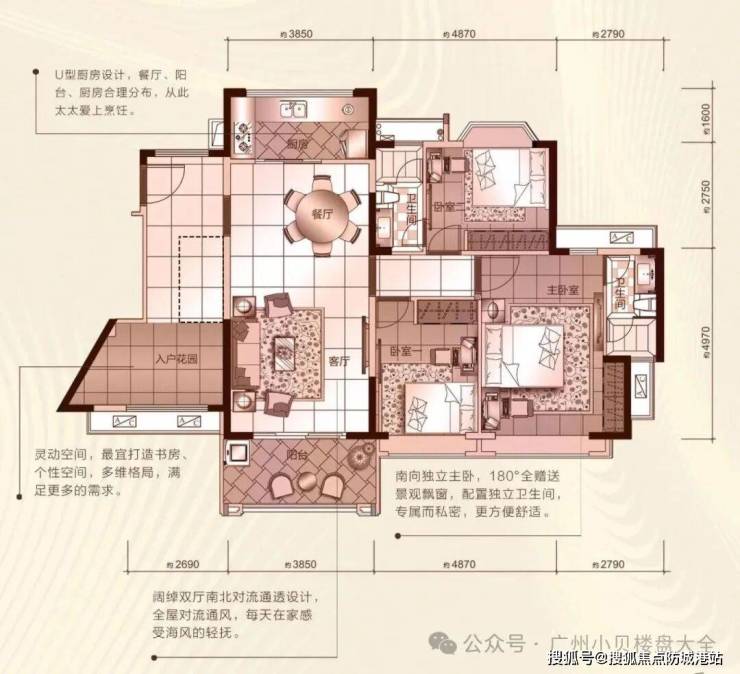厨房通常为U型或L型设计,操作台面充裕。房间分布动静分区,两个卧室与客厅同向南,共享阳光与好视野。主卧室是套房设计,配备独立卫生间,居住舒适度高。公卫干湿分离,方便使用。