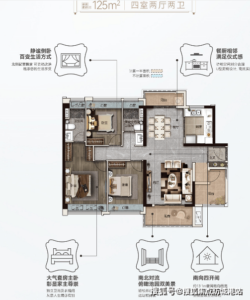 改善进阶户型:建面约125㎡四房两厅两卫,南北对流设计,可俯瞰池园美景,4.7米南向景观阳台,视野开阔,空间通透,四房布局合理,动静分区明确,主卧阔绰舒适,配备独立卫生间,保障业主隐私,适合改善型家庭居住,满足高品质居住需求。