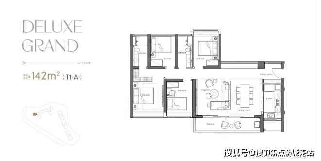 140㎡四房臻品:方正布局,南北对流,全明采光;大横厅设计,奢阔尺度,尽揽山、城、园三重盛景。