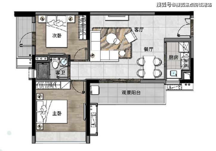 建面约76平户型还做到双阳台设计,其中一个阳台用来赏景、品茶、娱乐,另一个阳台则可以作为生活阳台。