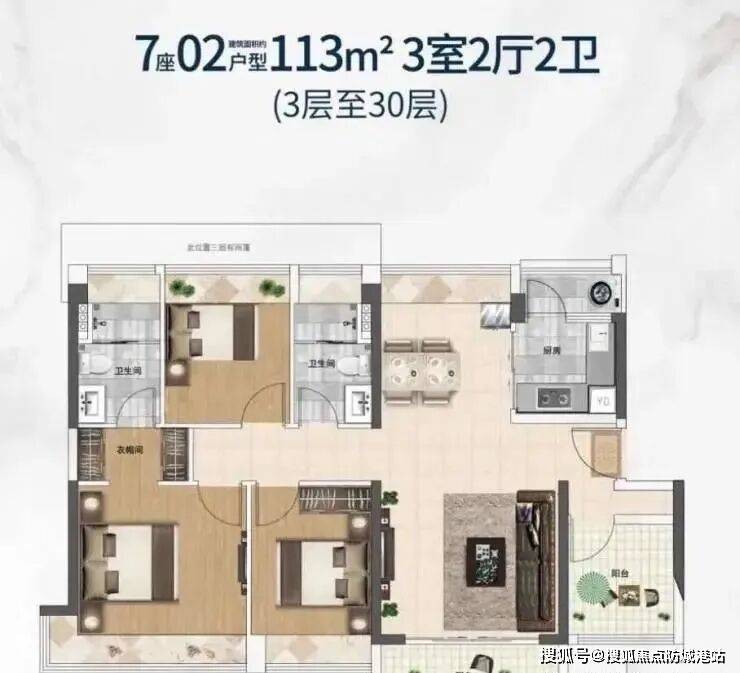 接下来是建筑面积约113平方米的3+1房两卫户型。该户型四开间朝南,南北对流设计,采光和通风效果俱佳。主卧独立卫浴,并带有衣帽间设计,为住户提供了尊崇的居住体验。双阳台设计增加了空间的利用率,多飘窗赠送也让房间显得更加宽敞明亮。