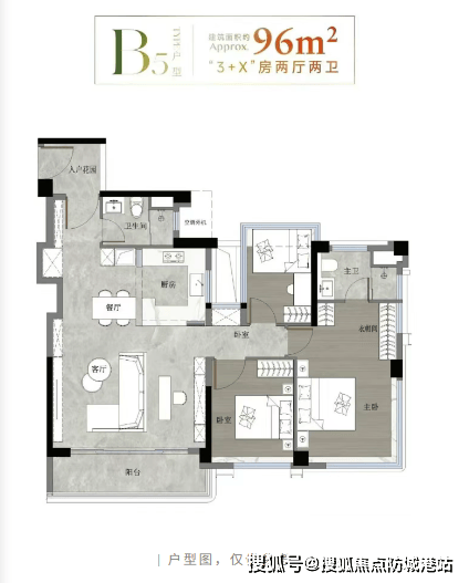 (建面约 96 平方米 3+X 房两厅两卫户型)