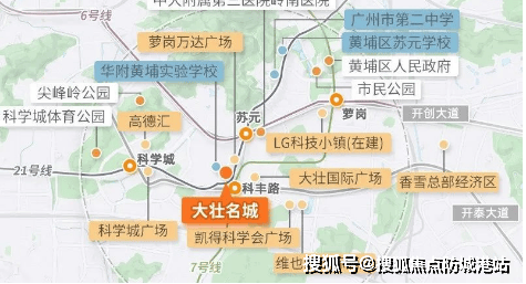 大壮名城坐落在科学城的核心区域,周边三条地铁线交汇——6号线、21号线和7号线二期,使得居民能够轻松通达广州的各个重要区域。具体来说,距离最近的暹岗站(6号线)步行仅需800米,而科丰路站(7号线)则大约900米。尽管苏元站(6/21号线)稍远一些,步行距离约为1.8公里,但总体来说交通便利性非常高。三地铁交汇的独特优势不仅提升了出行效率,也为该区域增添了显著的价值潜力。此外,项目周围还有多条公交线路,进一步增强了其交通枢纽的地位。