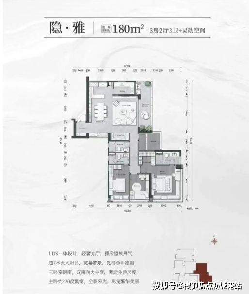180㎡旗舰四房:东南双面采光,部分单位规划双主卧套房,满足多代同住或高阶社交需求。