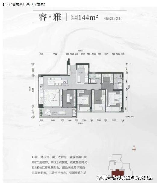 144㎡四房:南向布局,主卧套房带飘窗,居住舒适度高;