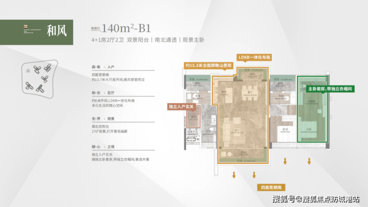 建面 140 平 4+1 房,同样四开间朝南,南向采光面达到 15.7 米,保证室内充足采光。南北双阳台设计,通风良好。LDKB 一体化设计,使空间更加通透开阔。主套配置 270 度折叠屏飘窗,独特设计提升居住体验,可多角度欣赏窗外景色。