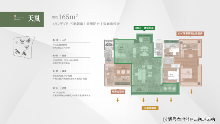 建面 165 平 4+1 房大平层,双阳台南北对流,通风顺畅。四开间朝南,中式厨房与独立西式岛台的搭配,满足不同烹饪需求。三面望山景,朝南面宽达到 17.4 米,近 9 米的 L 型景观阳台,将自然美景尽收眼底。双主套设计,保障家庭成员的私密性,主卧同样配备 270 度折叠屏飘窗,尽享舒适与奢华。